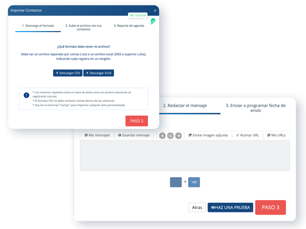 Sube los datos de tus clientes desde un archivo de Excel, o escribe los números uno por uno, redacta tu mensaje, agrega enlaces y textos personalizados.